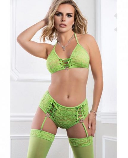 3pc Lace Up Bra Hi Waist Panty & Stocking Daring Tangy O/s