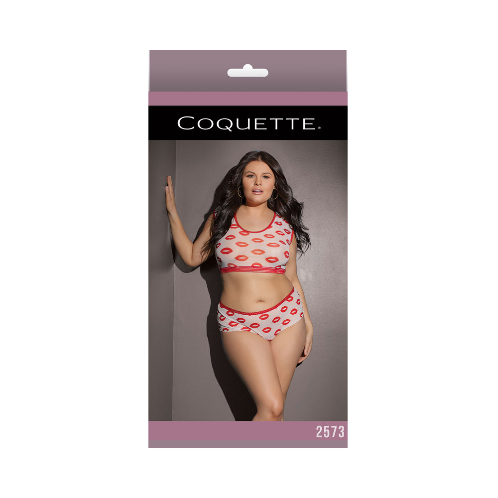 “Lip print crop top and booty short Crop top features underbust elastic detailing Booty short features lace up back detail White/Red | Mesh OS/XL” @winter2019-4 @vday2020-40