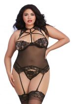 Bustier and G-String Black Queen Size from Dreamgirl lingerie line. Strappy Bustier ties like a halter and at the back for an adjustable fit. Matching g-string panty included. Ladies plus sizes, one size queen. Dress sizes 16 to 20. Weight 165 pounds to 275 pounds. Fabric content 90% Nylon, 10% Spandex. Care hand wash cold water. No bleach. Line dry. Please note stockings not included.