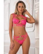 A beyond breathtaking cage top with wired laced cups with embroidery trim. The strappy neckline with laced back makes perfect match to a curve hugging strappy panty. Diamante details. Fabric composition 88% Polyamide, 12% Spandex. One size fits most. Bust 30 inches to 36 inches. A-C cups. Weight 110 pounds to 165 pounds. Waist 24 inches to 29 inches. Hips 34 inches to 39 inches. Sizes 0 to 10.