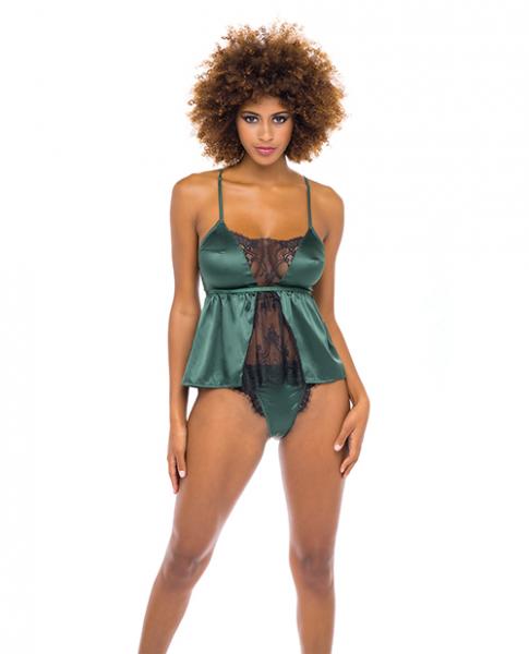 Cammi Eyelash & Satin Cami W/tanga Panty Dark Green/black S/m