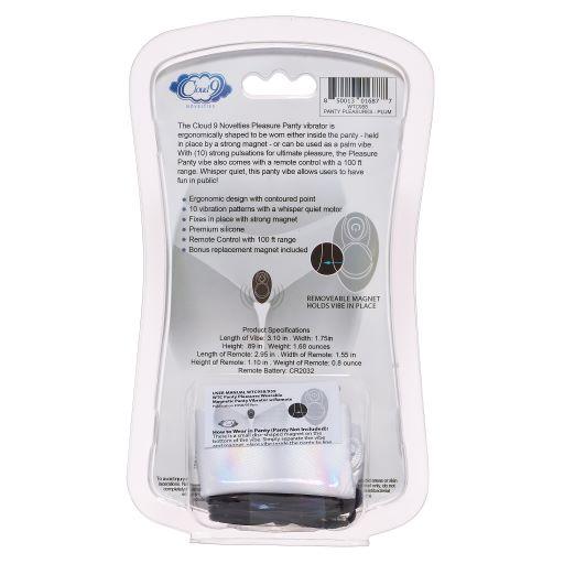 Cloud 9 Panty Pleasures Magnetic Panty Vibe Plum Purple from Cloud Nine Novelties. Wearable Vibe. Remote control. Panty not included. The Cloud 9 Novelties Pleasure Panty vibrator is ergonomically shaped to be worn either inside the panty: held in place by a strong magnet or can be used as a palm vibe. With 10 strong pulsations for ultimate pleasure, the Pleasure Panty vibe also comes with a remote control with a 100 feet range. Whisper quiet, this panty vibe allows users to have fun in public! Features: ergonomic design with contoured point. 10 vibration patterns with a whisper quiet motor. Fixes in place with strong magnet. Made using body safe, phthalate free Premium Silicone. Remote Control with 100 feet range. Bonus silk storage pouch included. Categories: Rechargeable Vibrators, Palm Size Massagers, Sex Toys for Women, Vibrating Underwear. 2022.