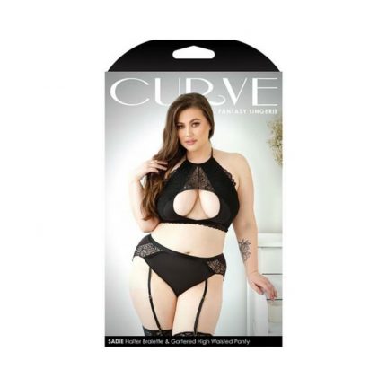 Curve Sadie Halter Bralette With Keyhole Cutout & Matching Gartered High-waisted Panty 1x/2x Black
