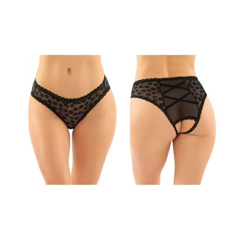Crotchless Lace and Mesh Panty With Criss-Cross Panel BackPANTIES SOLD IN PACKS OF 6 PER STYLE/SIZE/COLOR Brand: Bottoms Up Materials: 80% Nylon, 20% Spandex Color: Black