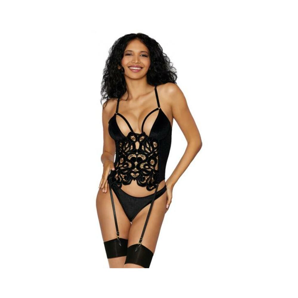 Stretch velvet corset with velvet embordered applique bodice detail featuring: Gold hardware accents Underwire cups with boning support Adjustable shoulder straps and hook and eye back closure Removeable/adjustable garters Stretch velvet thong included Shown with 0007 thigh-highs; sold separately Size Large: Size 10-14, Cup C/D, Weight 140-160 lbs., Bust 36-38″, Waist 29-31″, Hip 38-40″