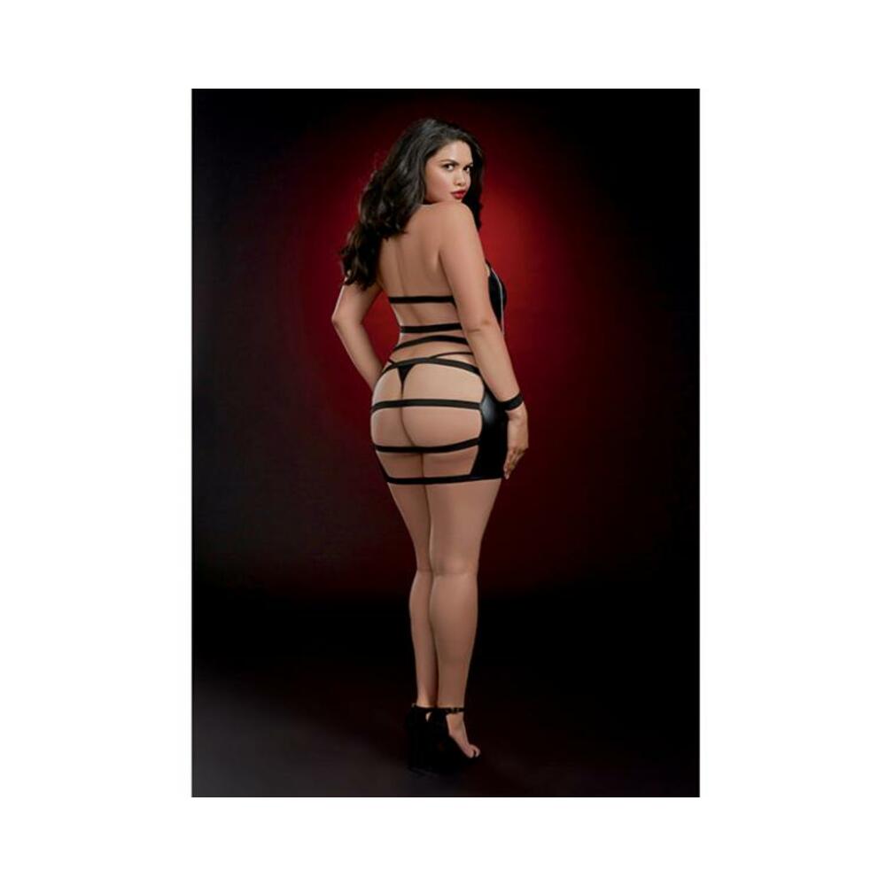 Leather-Look Knit Collared Chemise with Chain Restraints Removable chain wrist restraints Elastic strappy back and a velcro closure on collar Thong not included Care instructions: Wipe clean Imported Perfect for role-playing, bedroom play, spicing up romantic evenings, Valentine’s, anniversary gifts, or indulging in your favorite fantasy. Fabric content: Chemise: 95% polyester, 5% spandex Wrist cuffs: 60% polyester, 40% spandex Size OSQ: Size 16-22, Cup D/DD, Weight 180-260 lbs., Bust 40-50″, Waist 36-44″, Hip 42-52″