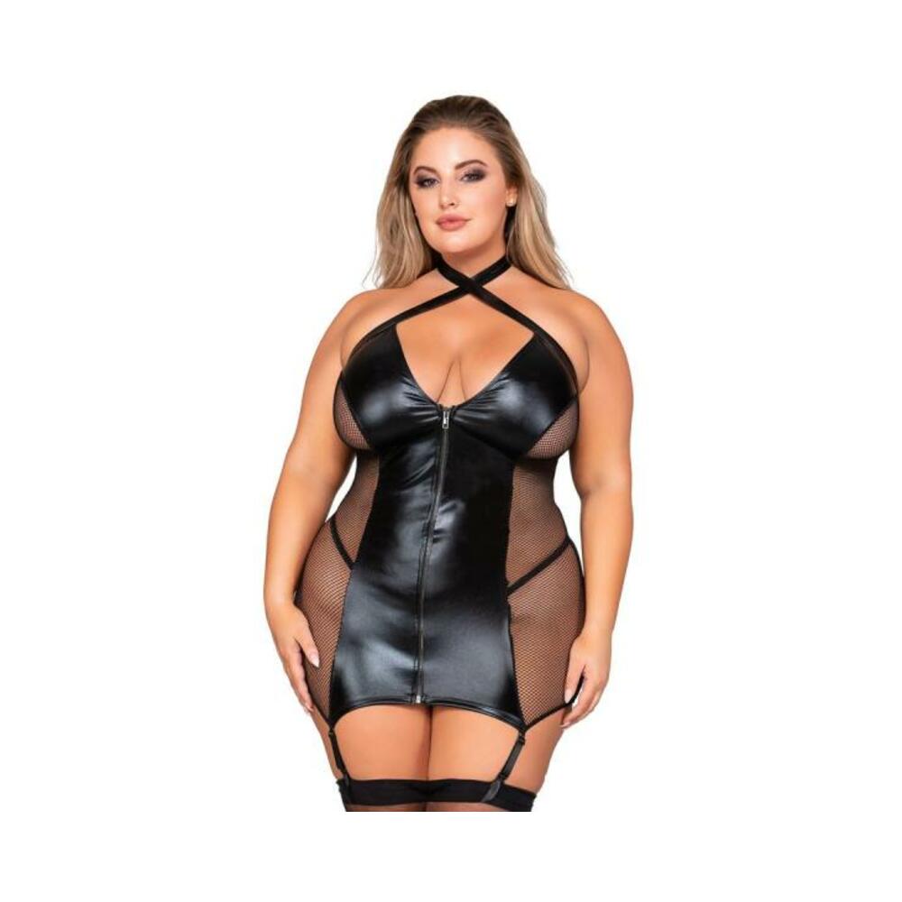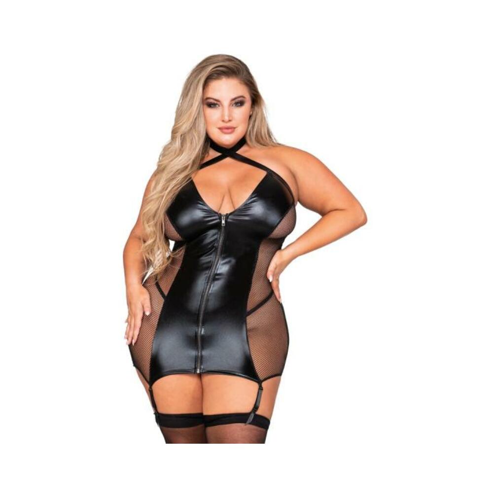 Stretch faux-leather and fishnet garter slip featuring: Criss-cross halter neckline with hook & eye back closure Front zipper detail Attached adjustable garters Matching G-string included Shown with style #0007 thigh-highs, sold separately Size OSQ: Size 16-22, Cup D/DD, Weight 180-260 lbs., Bust 40-50″, Waist 36-44″, Hip 42-52″