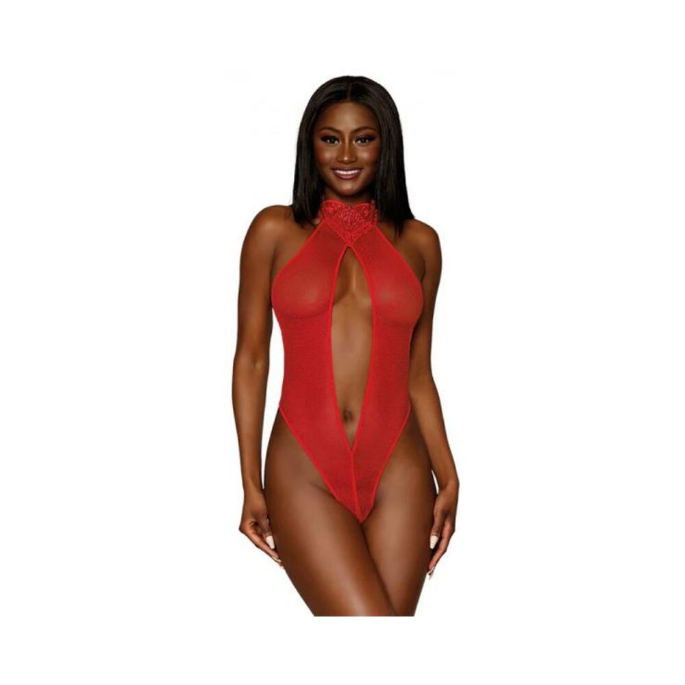 Stretch fishnet teddy with heart Venice trim details featuring: Plunging halter neckline with tie-back closure Open crotch Pearl G-string back Size OS: Size 2-14, Cup B/C, Weight 90-160 lbs., Bust 32-38″, Waist 24-31″, Hip 34-40″