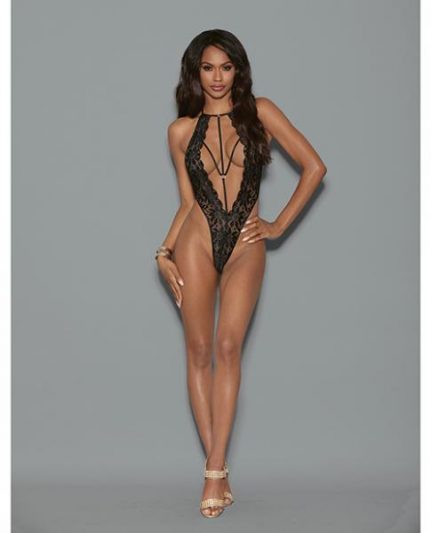 Release your inner vixen in this all over lace halter chemise set featuring sheer underwire cups, strappy chest detail, halter straps, full front zip, tie back closure, high ruched back, adjustable garter straps, and sheer thigh high stockings. (Panty not included.) From Escante. Queen. Size: 16-20. Cup: D/DD. Bust: 40in.-54in. Waist: 34in.-44in. Hip: 42in.-56in. Weight: 165-275lbs.