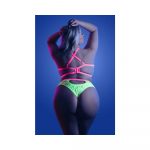 *UV REACTIVE* Open cup underwire bra Adjustable shoulder straps Cut-out cheeky panty Contrast elastic detail Materials: 90% Nylon, 10% Spandex Sizing Info: Q/S Cups: DD/DDD Bust: 40″-42″ Waist: 34″-38 Hips: 42″-48″