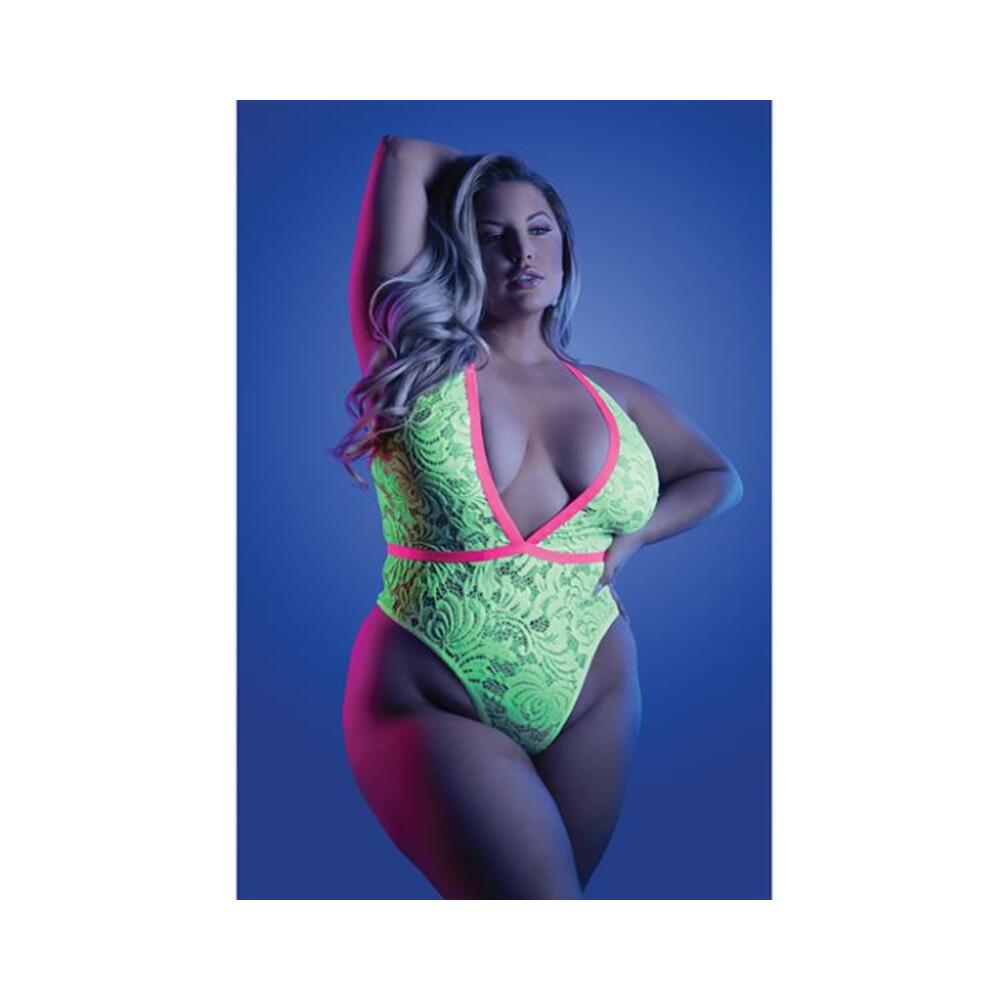Fantasy Lingerie Glow Spotlight Contrast Elastic Lace Teddy With Snap Closure Neon Green Queen Size