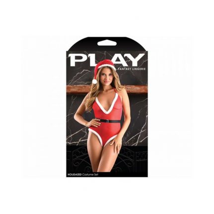 Fantasy Lingerie Play Holidazed Sheer Sparkle Mesh Teddy With Faux Fur Trim, Belt & Santa Hat Red S/