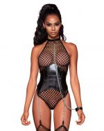 Fishnet Halter Teddy W/ Faux Leather Corset Black O/s