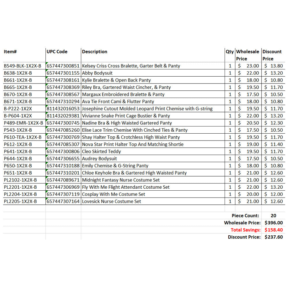 Item#: B549-BLK-1X2X-B | UPC#: 657447300851 | Kelsey Criss Cross Bralette, Garter Belt & Panty | Price: $ 13.8Item#: B638-1X2X-B | UPC#: 657447301155 | Abby Bodysuit | Price: $ 13.2Item#: B661-1X2X-B | UPC#: 657447308161 | Kylie Bralette & Open Back Panty | Price: $ 10.8Item#: B665-1X2X-B | UPC#: 657447308369 | Riley Bra, Gartered Waist Cincher, & Panty | Price: $ 11.7Item#: B670-1X2X-B | UPC#: 657447308567 | Margaux Embroidered Bralette & Panty | Price: $ 10.5Item#: B671-1X2X-B | UPC#: 657447310294 | Ava Tie Front Cami & Flutter Panty | Price: $ 10.8Item#: B-P222-1X2X | UPC#: 811432016053 | Josephine Cutout Molded Leopard Print Chemise with G-string | Price: $ 11.7Item#: B-P604-1X2X | UPC#: 811432029381 | Vivianne Snake Print Cage Bustier & Panty | Price: $ 13.2Item#: P489-EMR-1X2X-B | UPC#: 657447300745 | Nadine Bra & High Waisted Gartered Panty | Price: $ 12.3Item#: P543-1X2X-B | UPC#: 657447085260 | Elise Lace Trim Chemise With Cinched Ties & Panty | Price: $ 10.5Item#: P610-TEA-1X2X-B | UPC#: 657447300769 | Shay Halter Top & Crotchless High Waist Panty | Price: $ 11.7Item#: P612-1X2X-B | UPC#: 657447085307 | Nova Star Print Halter Top And Matching Shortie | Price: $ 11.4Item#: P641-1X2X-B | UPC#: 657447300806 | Cleo Skirted Teddy | Price: $ 11.7Item#: P644-1X2X-B | UPC#: 657447306655 | Audrey Bodysuit | Price: $ 10.5Item#: P650-1X2X-B | UPC#: 657447310188 | Emily Chemise & G-String Panty | Price: $ 10.8Item#: P651-1X2X-B | UPC#: 657447310201 | Chloe Keyhole Bra & Gartered High Waisted Panty | Price: $ 12.6Item#: PL2102-1X2X-B | UPC#: 657447089671 | Midnight Fantasy Nurse Costume Set | Price: $ 12.6Item#: PL2201-1X2X-B | UPC#: 657447306969 | Fly With Me Flight Attendant Costume Set | Price: $ 13.2Item#: PL2204-1X2X-B | UPC#: 657447307119 | Cosplay With Me Costume Set | Price: $ 12Item#: PL2205-1X2X-B | UPC#: 657447307164 | Lovesick Nurse Costume Set | Price: $ 12.6