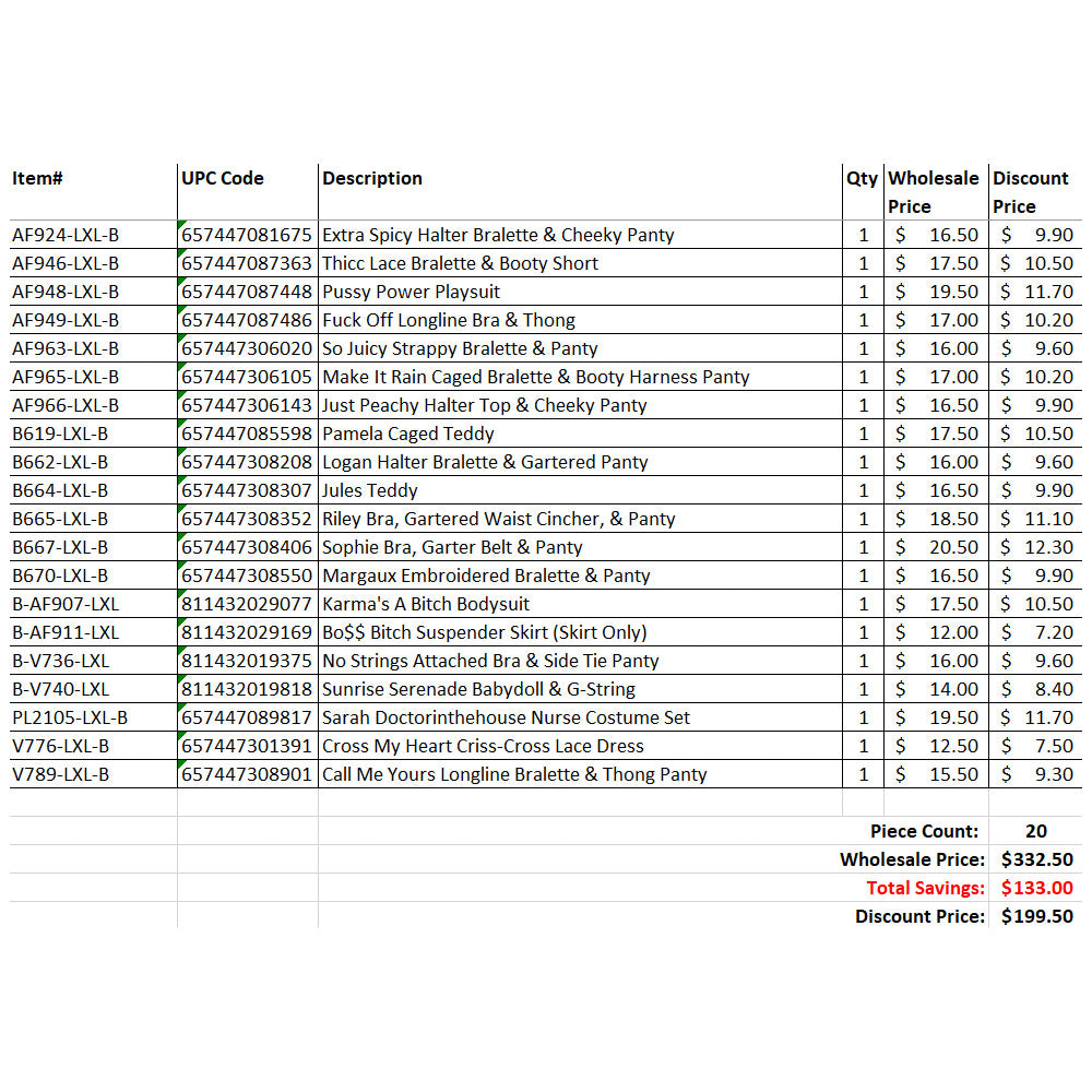 Item#: AF924-LXL-B | UPC#: 657447081675 | Extra Spicy Halter Bralette & Cheeky Panty | Price: $ 9.9Item#: AF946-LXL-B | UPC#: 657447087363 | Thicc Lace Bralette & Booty Short | Price: $ 10.5Item#: AF948-LXL-B | UPC#: 657447087448 | Pussy Power Playsuit | Price: $ 11.7Item#: AF949-LXL-B | UPC#: 657447087486 | Fuck Off Longline Bra & Thong | Price: $ 10.2Item#: AF963-LXL-B | UPC#: 657447306020 | So Juicy Strappy Bralette & Panty | Price: $ 9.6Item#: AF965-LXL-B | UPC#: 657447306105 | Make It Rain Caged Bralette & Booty Harness Panty | Price: $ 10.2Item#: AF966-LXL-B | UPC#: 657447306143 | Just Peachy Halter Top & Cheeky Panty | Price: $ 9.9Item#: B619-LXL-B | UPC#: 657447085598 | Pamela Caged Teddy | Price: $ 10.5Item#: B662-LXL-B | UPC#: 657447308208 | Logan Halter Bralette & Gartered Panty | Price: $ 9.6Item#: B664-LXL-B | UPC#: 657447308307 | Jules Teddy | Price: $ 9.9Item#: B665-LXL-B | UPC#: 657447308352 | Riley Bra, Gartered Waist Cincher, & Panty | Price: $ 11.1Item#: B667-LXL-B | UPC#: 657447308406 | Sophie Bra, Garter Belt & Panty | Price: $ 12.3Item#: B670-LXL-B | UPC#: 657447308550 | Margaux Embroidered Bralette & Panty | Price: $ 9.9Item#: B-AF907-LXL | UPC#: 811432029077 | Karma’s A Bitch Bodysuit | Price: $ 10.5Item#: B-AF911-LXL | UPC#: 811432029169 | Bo$$ Bitch Suspender Skirt (Skirt Only) | Price: $ 7.2Item#: B-V736-LXL | UPC#: 811432019375 | No Strings Attached Bra & Side Tie Panty | Price: $ 9.6Item#: B-V740-LXL | UPC#: 811432019818 | Sunrise Serenade Babydoll & G-String | Price: $ 8.4Item#: PL2105-LXL-B | UPC#: 657447089817 | Sarah Doctorinthehouse Nurse Costume Set | Price: $ 11.7Item#: V776-LXL-B | UPC#: 657447301391 | Cross My Heart Criss-Cross Lace Dress | Price: $ 7.5Item#: V789-LXL-B | UPC#: 657447308901 | Call Me Yours Longline Bralette & Thong Panty | Price: $ 9.3