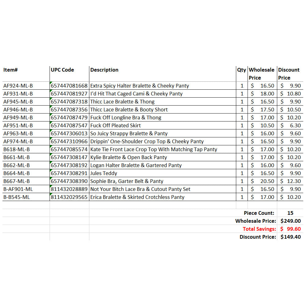 Item#: AF924-ML-B | UPC#: 657447081668 | Extra Spicy Halter Bralette & Cheeky Panty | Price: $ 9.9Item#: AF931-ML-B | UPC#: 657447081927 | I’d Hit That Caged Cami & Cheeky Panty | Price: $ 10.8Item#: AF945-ML-B | UPC#: 657447087318 | Thicc Lace Bralette & Thong | Price: $ 9.9Item#: AF946-ML-B | UPC#: 657447087356 | Thicc Lace Bralette & Booty Short | Price: $ 10.5Item#: AF949-ML-B | UPC#: 657447087479 | Fuck Off Longline Bra & Thong | Price: $ 10.2Item#: AF951-ML-B | UPC#: 657447087547 | Fuck Off Pleated Skirt | Price: $ 6.3Item#: AF963-ML-B | UPC#: 657447306013 | So Juicy Strappy Bralette & Panty | Price: $ 9.6Item#: AF974-ML-B | UPC#: 657447310966 | Drippin’ One-Shoulder Crop Top & Cheeky Panty | Price: $ 9.9Item#: B618-ML-B | UPC#: 657447085574 | Kate Tie Front Lace Crop Top With Matching Tap Panty | Price: $ 10.2Item#: B661-ML-B | UPC#: 657447308147 | Kylie Bralette & Open Back Panty | Price: $ 10.2Item#: B662-ML-B | UPC#: 657447308192 | Logan Halter Bralette & Gartered Panty | Price: $ 9.6Item#: B664-ML-B | UPC#: 657447308291 | Jules Teddy | Price: $ 9.9Item#: B667-ML-B | UPC#: 657447308390 | Sophie Bra, Garter Belt & Panty | Price: $ 12.3Item#: B-AF901-ML | UPC#: 811432028889 | Not Your Bitch Lace Bra & Cutout Panty Set | Price: $ 9.9Item#: B-B545-ML | UPC#: 811432029565 | Erica Bralette & Skirted Crotchless Panty | Price: $ 10.2