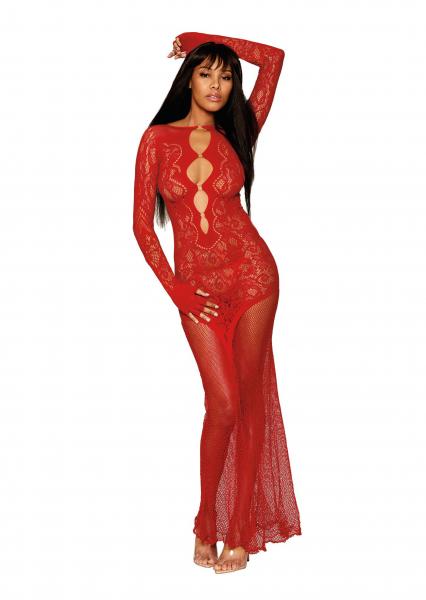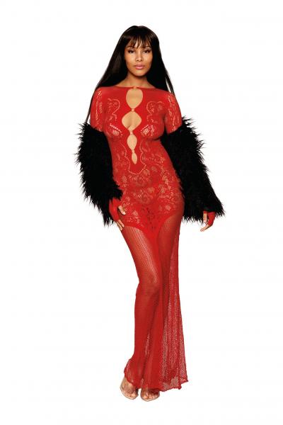 Floral Lace Bodystocking Gown Ruby Red O/S from Dreamgirl Lingerie. Long sleeve with finger holes. Open accents down the front down to almost the belly button of the Gown. One size. Ladies sizes 2 to 14. Weight 90 pounds to 160 pounds. Care hand wash in cold water. No bleach. Line dry. Shown with Black Gloves, not included. Categories: Lingerie, Clothing, Naughty Role Play, Sleep and Lounge, Slips, One Size. Restricted, Amazon Restricted. 2023.
