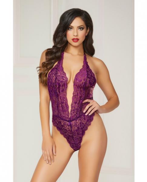 Home Women's Lingerie Teddys Floral Lace Teddy Halter Ties & Snap Crotch Purple O/S