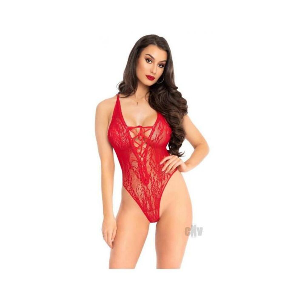 Floral lace thong teddy with lace up front and adjustable cross over back straps. O/S RED