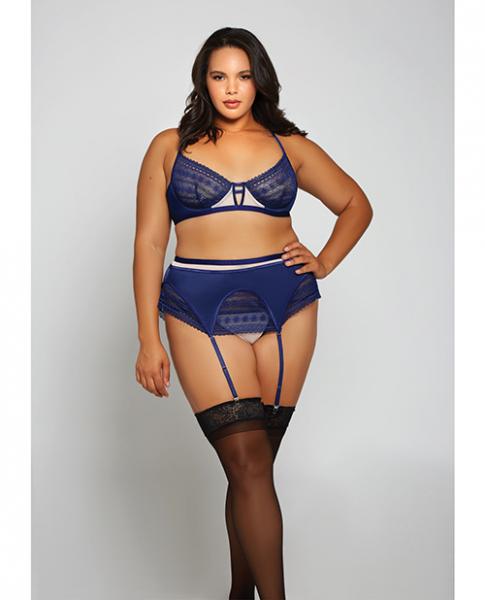 Home Women's Lingerie Garters Geometric Lace W/matte Microfiber Bra, Garter Belt & G-string Navy/beige 2x