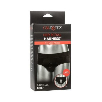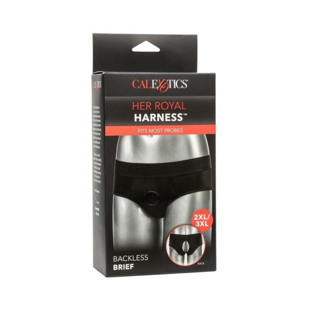 The Her Royal Harnessandtrade; Backless Brief is an ultra-comfortable harness fashioned like a risquandeacute; backless brief with powerful performance and comfort in mind. This bold harness has an extra-wide waistband, soft stretchy fabric and reinforced O ring for the ultimate support. The durable, reinforced O-ring stretches to accommodate your favorite probe, packer, vibrator or dildo. With a form-fitting design, this comfort harness can be worn discreetly under clothes. Enjoy pleasure made for two with the double panel interior for easy access to your favorite probe. Beginners and expert users alike will love frustration-free pleasure with this easy-to-wear harness. Simply secure your favorite probe, slip into the bold backless brief and dive deep into passionate penetration or enjoy comfortable all-day wear. Enjoy easy clean up by machine washing and hanging to dry. Size 2XL to 3XL.