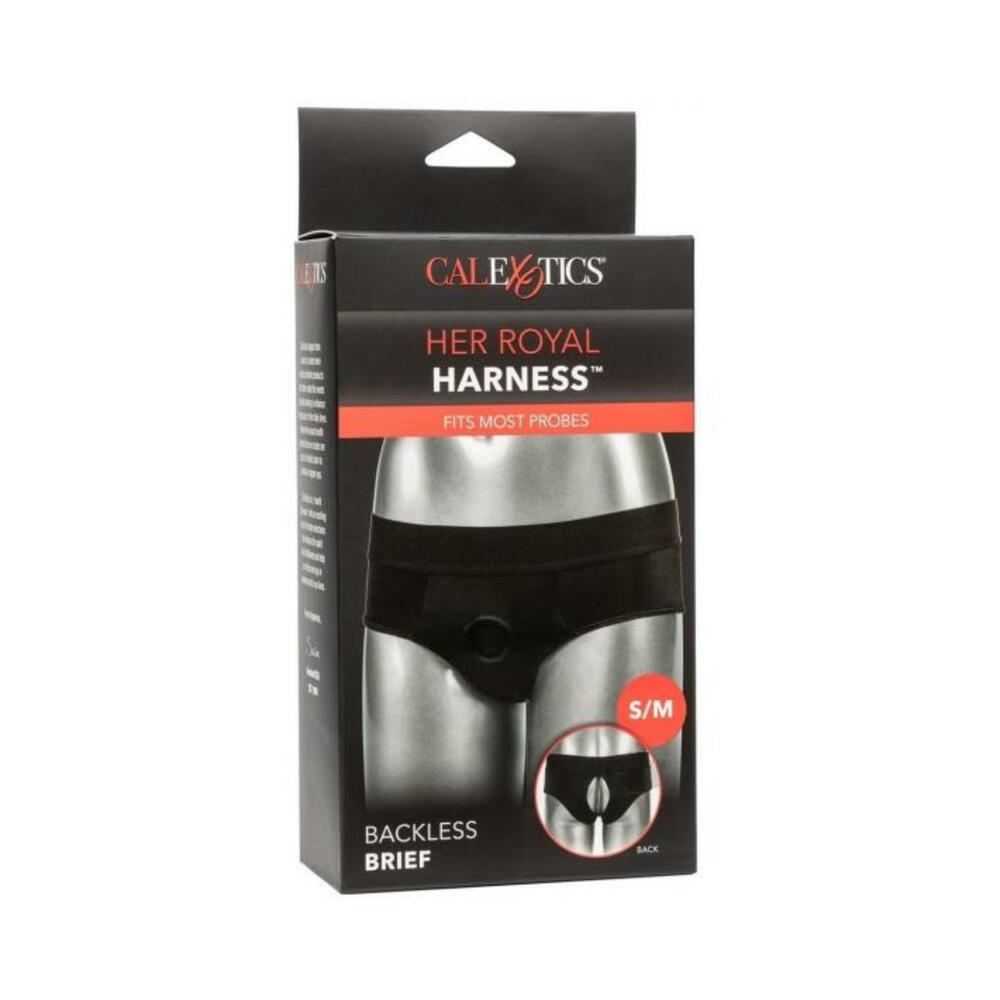 The Her Royal Harnessandtrade; Backless Brief is an ultra-comfortable harness fashioned like a risquandeacute; backless brief with powerful performance and comfort in mind. This bold harness has an extra-wide waistband, soft stretchy fabric and reinforced O ring for the ultimate support. The durable, reinforced O-ring stretches to accommodate your favorite probe, packer, vibrator or dildo. With a form-fitting design, this comfort harness can be worn discreetly under clothes. Enjoy pleasure made for two with the double panel interior for easy access to your favorite probe. Beginners and expert users alike will love frustration-free pleasure with this easy-to-wear harness. Simply secure your favorite probe, slip into the bold backless brief and dive deep into passionate penetration or enjoy comfortable all-day wear. Enjoy easy clean up by machine washing and hanging to dry. Size Small to Medium.