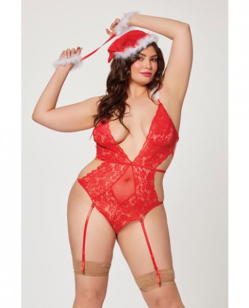 Holiday Strappy Lace Santa Teddy w/Marabou Handcuffs & Hat. From Seven Til Midnight. Queen. Size: 16-20. Cup: C-DD. Bust: 40in.-50in. Waist: 36in.-44in. Hip: 42in.-56in.