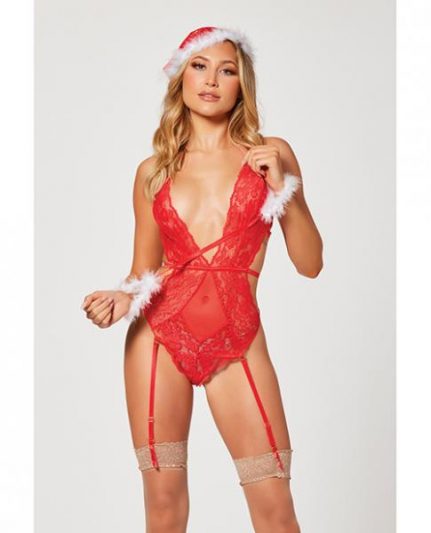Home Women's Lingerie Teddys Holiday Strappy Lace Santa Teddy W/marabou Handcuffs & Hat Red Qn