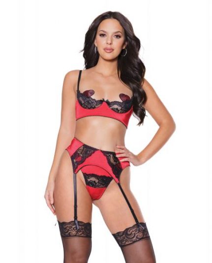Holiday Stretch Knit & Lace Demi Cup Bra, Garter Belt & Thong Red/black Lg