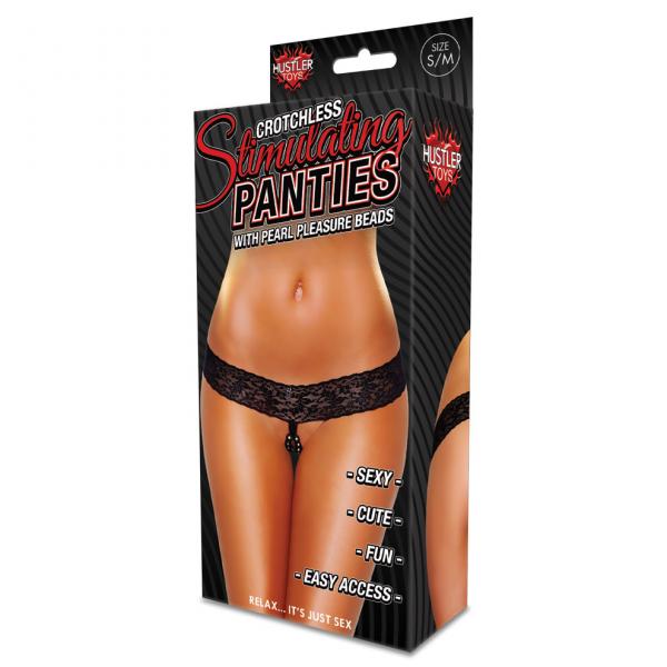 Hustler Crotchless Stimulating Thong With Pearl Pleasure Beads Black S/M