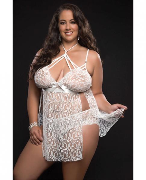 This forever romantic babydoll set features sheer cups with a strappy chest, satin bow accents, adjustable spaghetti straps, a hook and eye back closure, a flyaway open skirt, and a matching strappy g-string panty. FABRIC: 88% Polyamide 12% Spandex. Queen, Bust: 38in.-43in. Waist 30in.-35in. Hip: 40in.-45in. Size: 12-18.