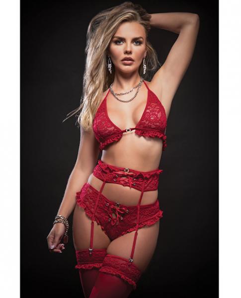 Lace Halter Bra, Lace Up Panties W/built In Garter Belt & Stockings Red O/s