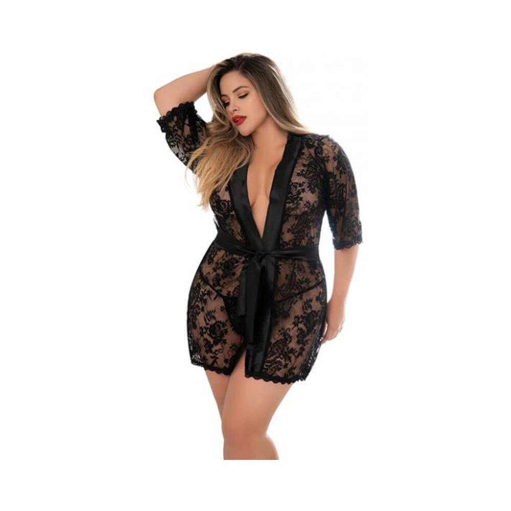 Comfort meets Sexy. Short lace robe with satin collar and belt, comes with matching G-String. 88% Nylon 12% Elastane / 88% Nylon 12% Elastane. Hand Wash. Do not Bleach. Do not Iron. 2X-3X – Bust 48-51 inches. Waist 37-39 inches. Hips 47-49 inches.