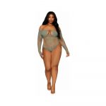 Long Sleeve Teddy Sage Green Queen Size from Dreamgirl Lingerie. Experience the allure of the Seamless Long Sleeve Teddy, blending intricate opaque and fishnet detailing alongside a captivating novelty pattern bodice, designed to mesmerize and flatter. Enhancing its elegance, this Teddy boasts a removable gold halter chain, offering versatility in styling options and adding a touch of sophisticated glamour to your look. The seamless construction ensures a sleek and comfortable fit, ideal for all day wear or intimate moments. The combination of long sleeves and novelty bodice pattern offers a unique and stylish aesthetic, perfect for making a bold statement in your lingerie collection. Queen size fits most plus ladies. Sizes 16 to 20. Weighting between 165 pounds to 275 pounds. Categories: Lingerie, Clothing, Naughty Role Play, Teddy, Teddies. Restricted, Amazon Restricted. 2024.