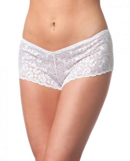 Low Rise Stretch Scallop Lace Booty Short from Coquette lingerie line. Color White. Ladies plus size, OS/XL. Weight 170 pounds to 200 pounds. Waist 32 inches to 40 inches. Hips 42 inches to 50 inches. Dress sizes 14 to 20.