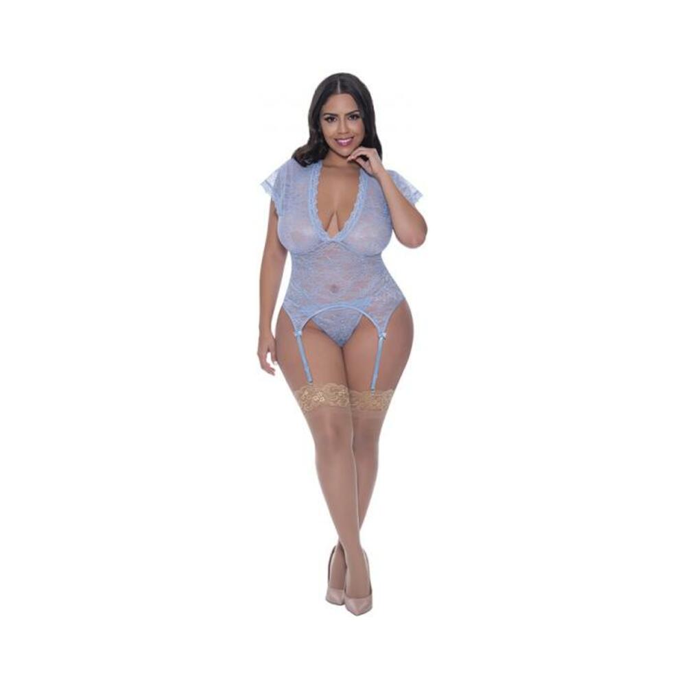 Home Women's Lingerie Magic Silk Ooh La Lace Cap Sleeve Basque & Tanga Set Periwinkle Queen Size