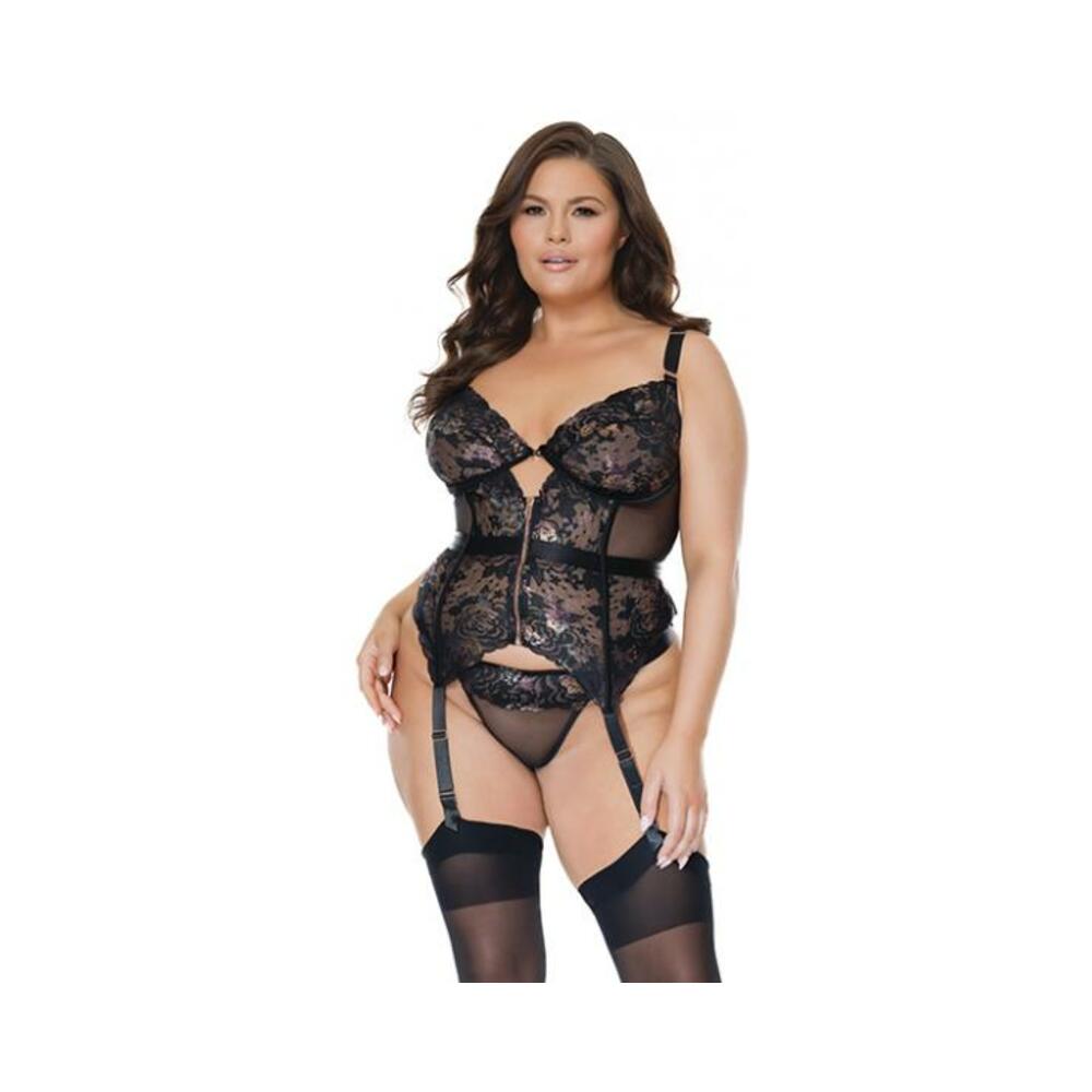 Metallic Stretch Lace Garter Belt Bustier W/lace Up Closure & Thong Black/rose Gold 3x/4x