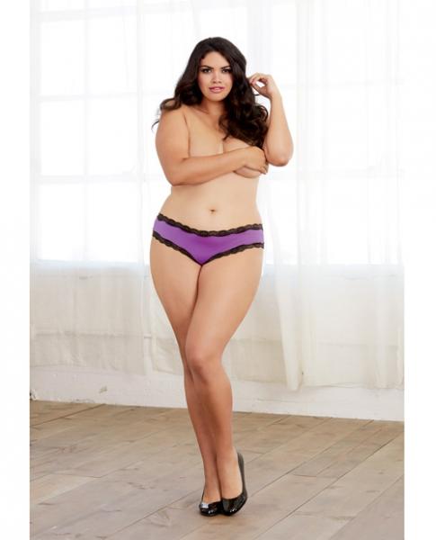 Micofiber cheeky panty with stretch lace trim and elastic criss cross open back detail. From Dreamgirl lingerie. Fabric contents 90% Polyester, 10% Spandex. Color Iris Purple, Black. Ladies plus size 3X. Sizes 24 and 26. Waist 46 inches to 48 inches. Hips 54 inches to 56 inches. Weight 260 pounds to 300 pounds.