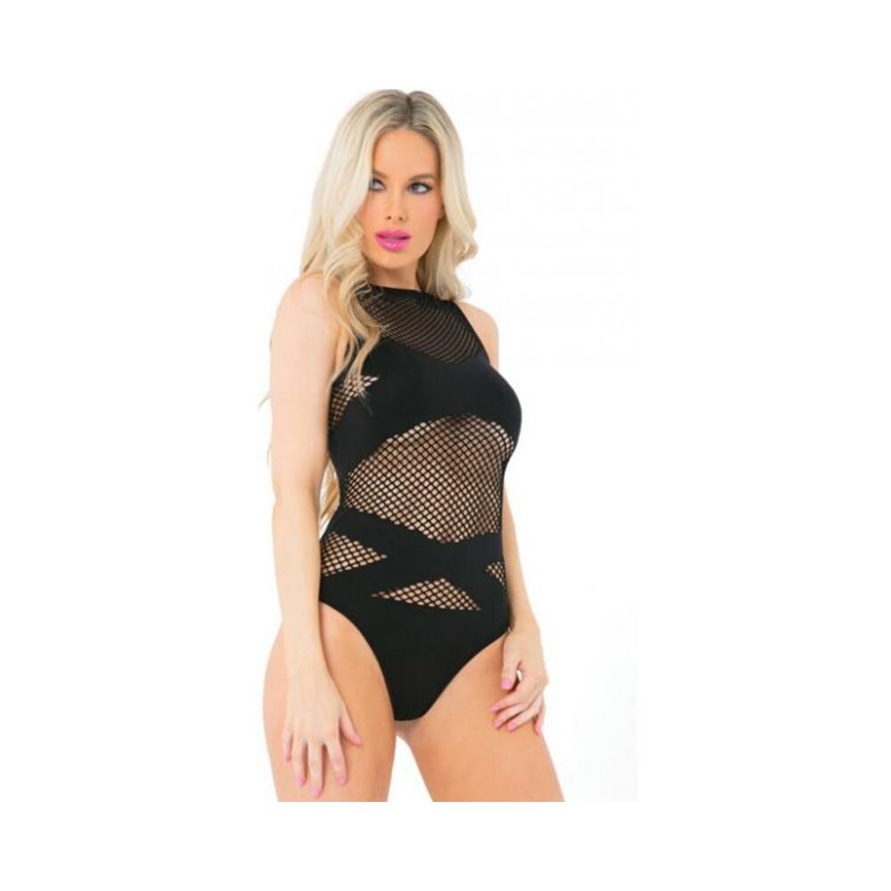 Fishnet Body suit with criss cross detail in all the right places. Fabric content 92% Nylon 8% Spandex. Color Black. One size fits most. Bust 31 inches to 37 inches. Waist 23 inches to 29 inches. Hips 33 inches to 39 inches. Cups B/C. Dress sizes 4 to 12.