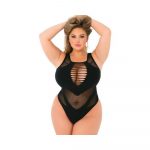 This sexy black bodysuit features a high neckline, an open front panel with ribbed detailing, sheer fishnet panels, a ribbed back panel, and a thong cut back. Color Black. Ladies plus size, one size queen. Bust 43 inches to 50 inches. Waist 34 inches to 42 inches. Hips 44 inches to 52 inches. Cups D/DD. Dress sizes 16 to 22.