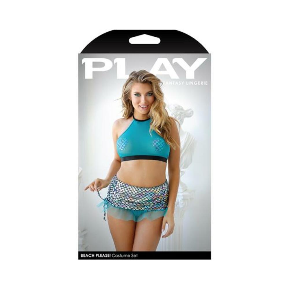 High-Neck Halter Top, Ruched Side Tie Skirt with Tulle Trim, G-String Panty & Matching Shell Pasties Brand: Play Materials: 80% Nylon, 20% Spandex Color: Teal Washing Instructions: Hand wash separately in cold water. Do not bleach. Flat dry. S/M Size: 2-6 Bust: 32″-36″ Hips: 33″-38″