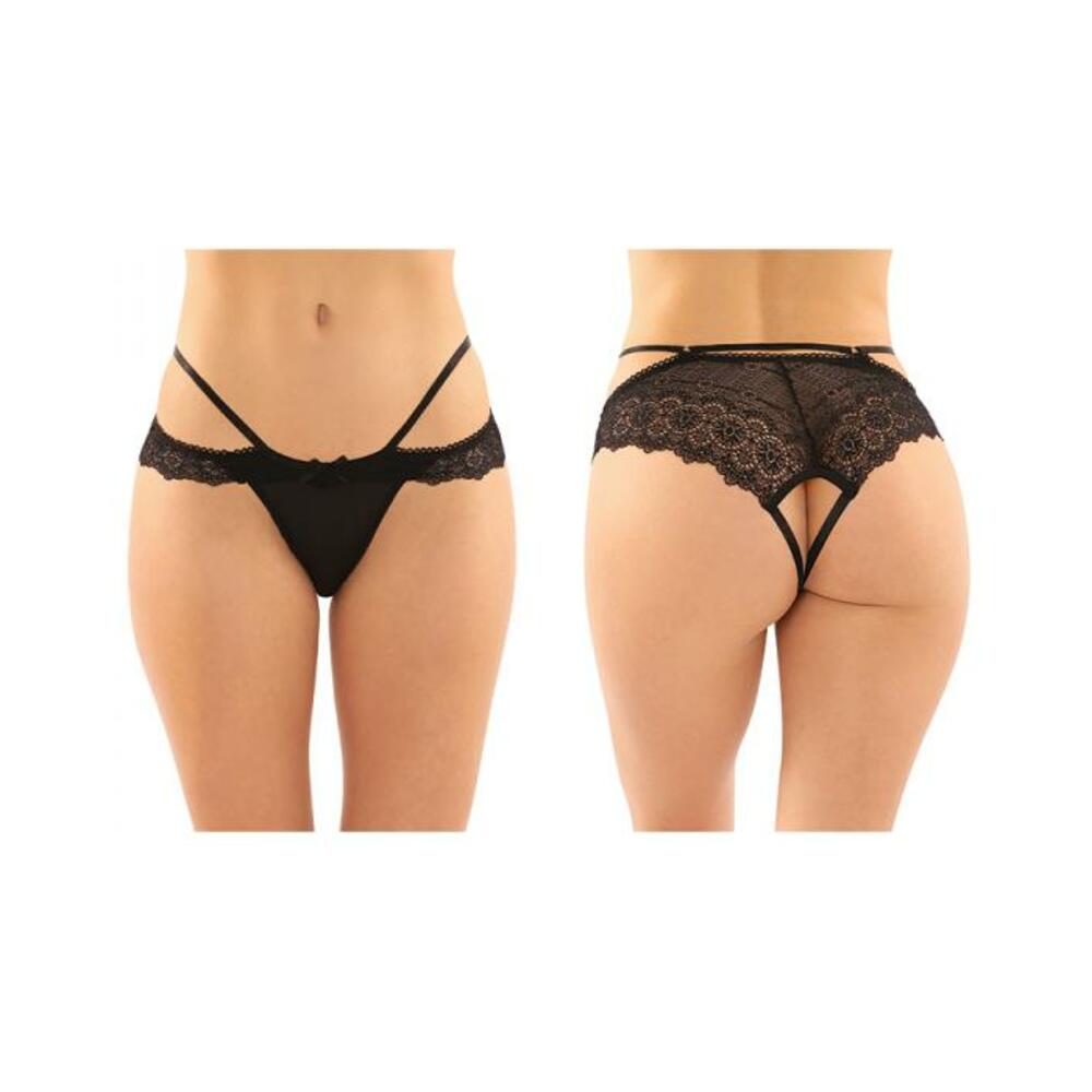 Strappy Lace and Microfiber Crotchless PantyPANTIES SOLD IN PACKS OF 6 PER STYLE/SIZE/COLOR Brand: Bottoms Up Materials: 80% Nylon, 20% Spandex Color: Black