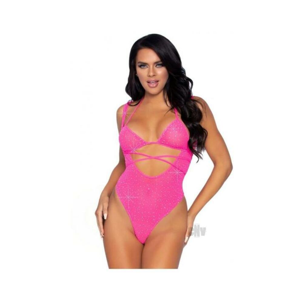2 PC Rhinestone mesh wrap around bikini top and suspender bodysuit. O/S NEON PINK