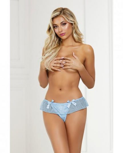 Satin jacquard and dot mesh skirted thong with satin ribbon bows. Fabric: 92% Polyester 8% Elastane. XL. Size: 14-16. Cup: C/D. Bust: 38in.-40in. Waist: 30in.-34in. Hip: 40in.- 42in.