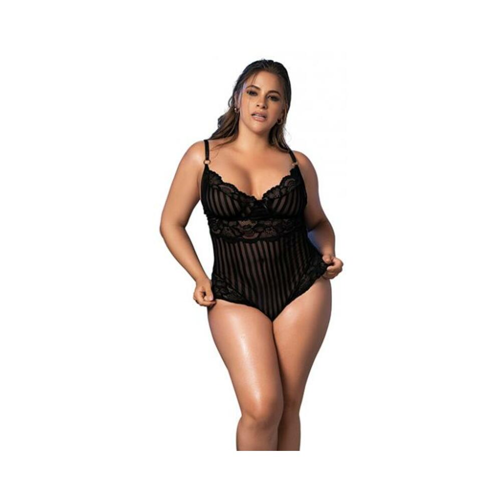 Shadow Stripe & Lace Teddy W/hook & Eye Closure Black 1x/2x