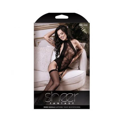 High-Neck Gartered Teddy Bodystocking with Opaque Lace-Up Design Brand: Sheer Fantasy Materials: 90% Nylon 10% Spandex Color: Black Washing Instructions: Hand wash separately in cold water. Do not bleach. Flat dry. Queen Size: 14-18 Bust: 42″-46″ Hips: 42″-49″