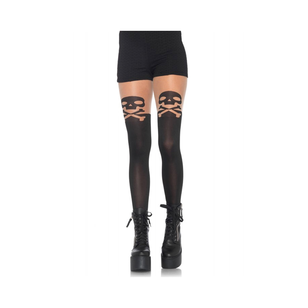Spandex skull and crossbone opaque pantyhose with sheer thigh accent. One size fits most.