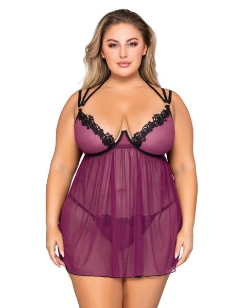 Stretch Mesh Babydoll with Contrast Lace Mulberry Q/S from Dreamgirl Lingerie. Stretch Mesh Babydoll and G-String Set with Venice Lace Trim. Stretch mesh babydoll with contrast Venice lace trim details featuring: underwire cups with adjustable tie back closure. Adjustable triple shoulder strap detail with silver ring accent. Matching open crotch G-String Panty included. One size fits plus size ladies 16 to 20 sizes. Cups D/DD. Bust 40 inches to 54 inches. Waist 36 inches to 44 inches. Hips 42 inches to 56 inches. Weighing between 165 pounds to 275 pounds. Care hand wash in cold water. No bleach. Line dry. Dreamgirl – Lingerie. 2022. Comfy meets sexy. Make a statement in sexy loungewear and cozy sleepwear accented with delicate lace fabrics, embroidery, and more. Last image is a size chart for Dreamgirl International.