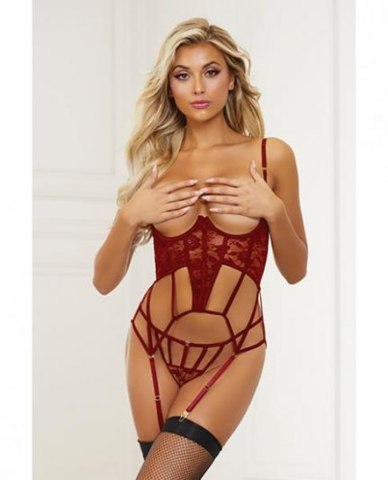Two piece babydoll set. Lace and strappy babydoll with open cups, flyaway front, adjustable straps, hook and eye back, gold hardware, and g-string. Seven Til Midnight. Fabric: 90% Nylon 10% Elastane. Queen. Size: 16-20. Cup: C-DD. Bust: 40in.-50in. Waist: 36in.-44in. Hip: 42in.-56in.